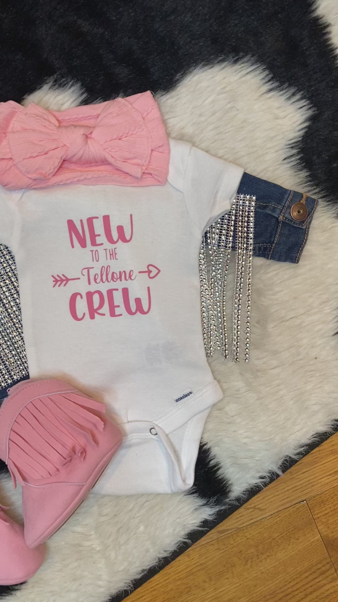 New to the (add your last name) crew onesie 🤍 White newborn onesie decorated in your color choice of pink, blue or black vinyl. The perfect gift for baby showers and mamas to be 👶🏼🍼 (Rhinestone fringe jean jacket sold separately).