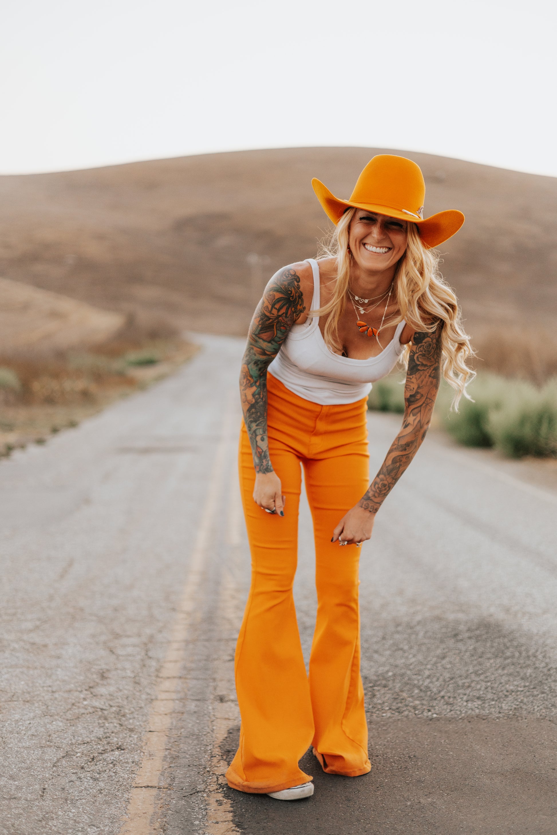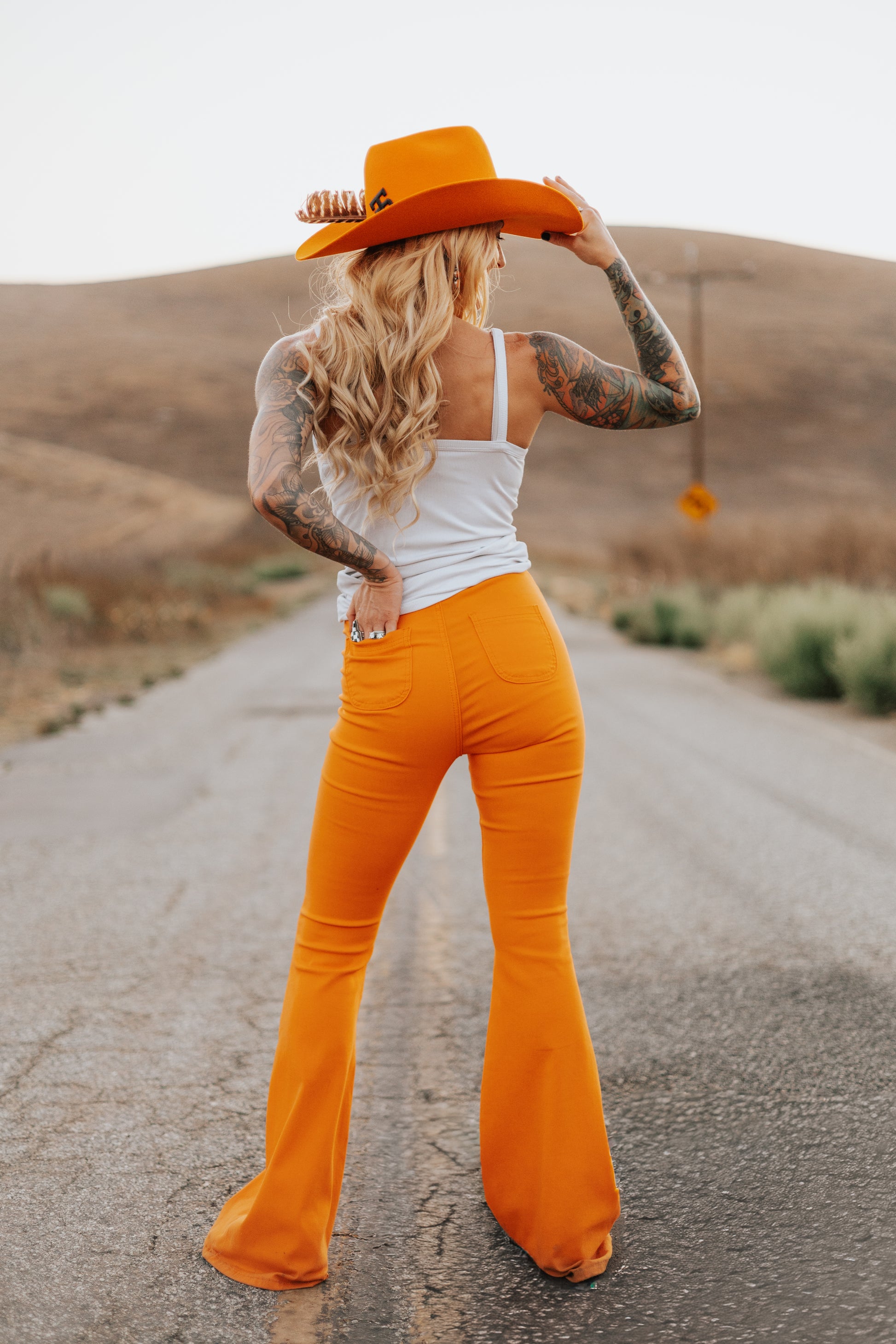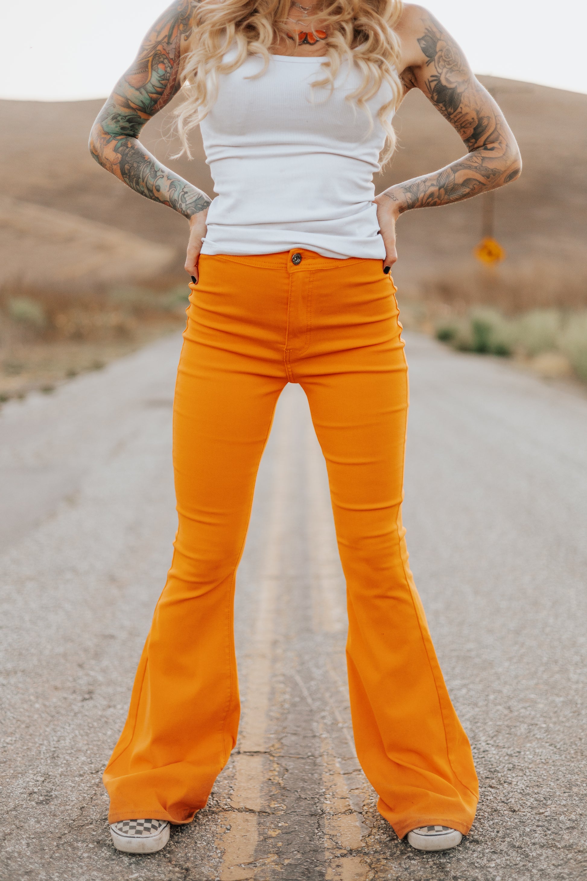 Make a statement with our bright and bold orange spooky season flare pants. High waisted, super stretchy and snatches you in all the right places. We wont want to take these off!
